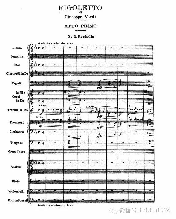 4月7日16:00时,由FM102.6哈尔滨古典音乐广播举办的第二期古典音乐知识讲座将在南岗区衡山路56号书香门第咖啡厅举办古典音乐知识讲座活动。这次我们邀请到了哈尔滨师范大学音乐学院教师,毕业于保加利亚音乐舞蹈艺术学院音乐学与歌剧表演的龚天卓博士和大家一起欣赏威尔第谱写的歌剧《弄臣》。下图是歌剧《弄臣》的部分谱例。